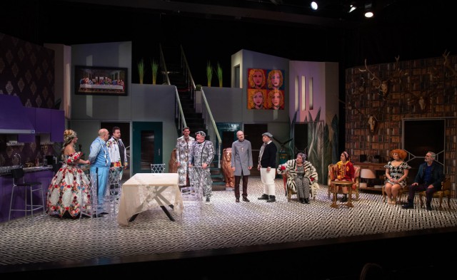 Balról ultramodern lila konyhapult, minimalista étkezőasztal, jobbra barokkos-rokokós ülőgarnitúra, középen égbe/ből vezető lépcső, kétoldalt arany oroszlánszobrokkal.